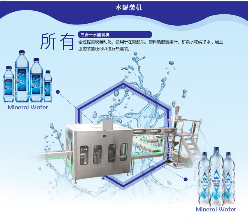 全過(guò)程實(shí)現(xiàn)自動(dòng)化、適用于在聚酯瓶、塑料瓶灌裝果汁、礦泉水和純凈水,加上溫控裝置還可以進(jìn)行熱灌裝。