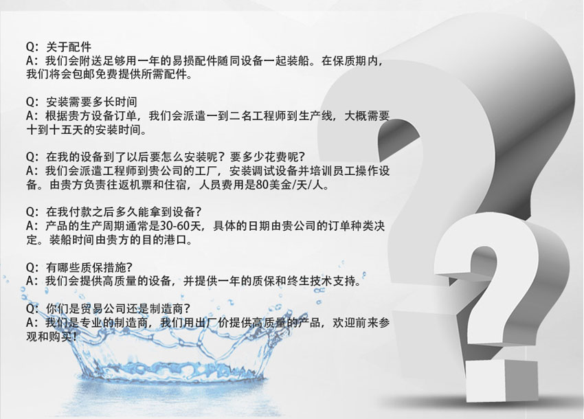 1.我們會(huì)從派我們廠里的工程師幫助安裝,調(diào)試和培訓(xùn)。
