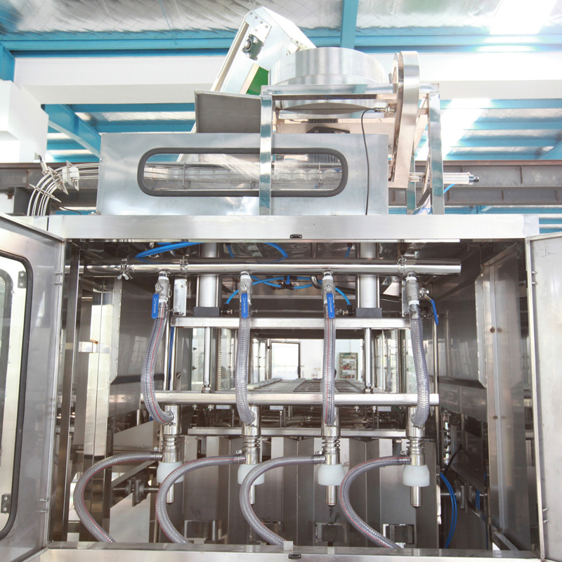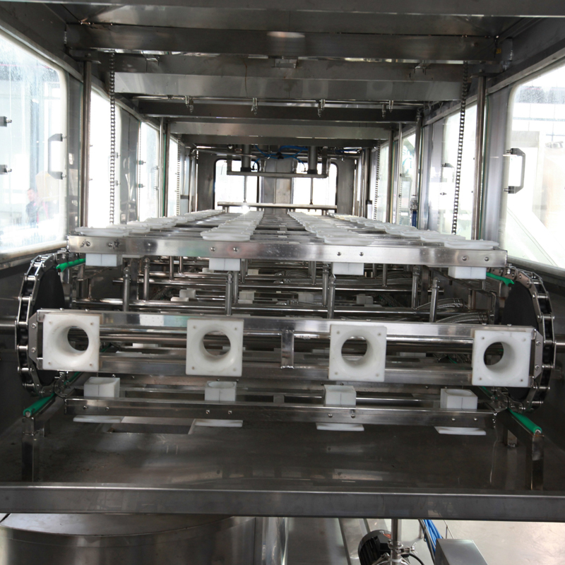 本灌裝生產(chǎn)線專用于3-5加侖桶裝水的灌裝,型號(hào)包括了QGF-100,QGF-240,QGF-300,QGF-450,QGF-600,QGF-900,QGF-1200。合消毒、沖洗、灌裝、壓蓋四為一體。沖洗機(jī)采用了多種洗液以及消毒液對(duì)瓶子進(jìn)行清洗以及消毒,消毒液能夠循環(huán)使用。瓶蓋會(huì)在清洗和消毒后運(yùn)至旋蓋機(jī)自動(dòng)進(jìn)行旋蓋。本產(chǎn)品功能齊全,涵蓋了清洗、消毒、灌裝、旋蓋、計(jì)數(shù)等功能,高度自動(dòng)化,實(shí)為飲料生產(chǎn)廠家理想的優(yōu)選設(shè)備。