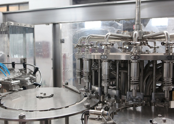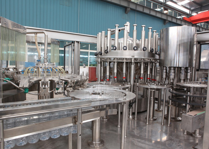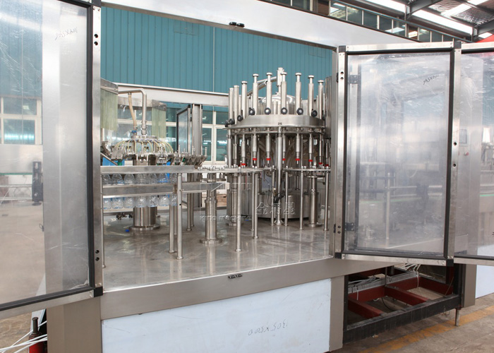 飲用水灌裝機(jī)集沖洗、灌裝、旋蓋于一體,全過程自動化運行,主要適用礦泉水、純凈水等不含氣飲料的沖瓶、灌裝、封口連續(xù)作業(yè)。本機(jī)大部分電器系統(tǒng)零件均采用國外優(yōu)良產(chǎn)品,所有與液料接觸的地方均采用優(yōu)質(zhì)的不銹鋼材料制作,主關(guān)鍵部件采用數(shù)控機(jī)床精密加工, 整機(jī)光電檢測各部件的運行狀況,無瓶不灌裝,無瓶不送蓋,自動化程度高,操作簡易,具有耐磨、穩(wěn)定、故障率低等特點,產(chǎn)品質(zhì)量處于行業(yè)前列,是新老飲料投資者的選擇。